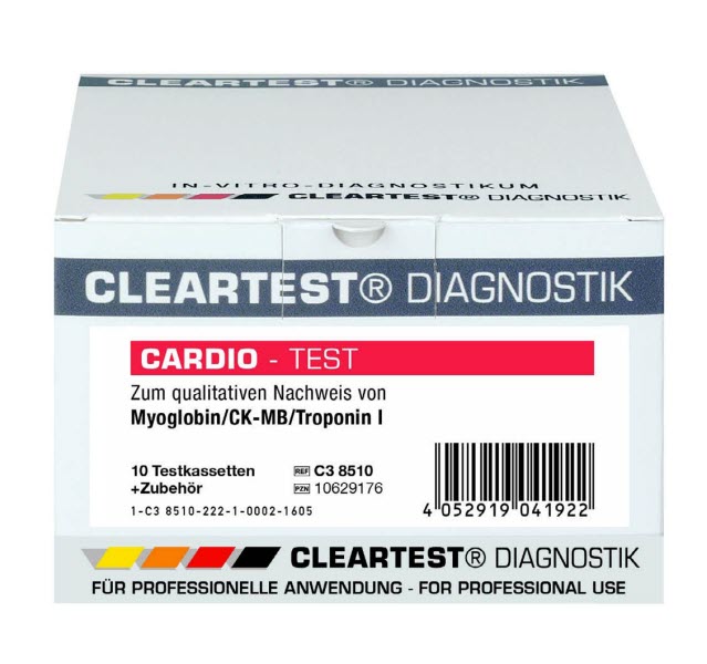 Der CLEARTEST Cardio spielt mit seinen 3 Herzmarkern Myoglobin, CK-MB und Troponin I in der Differenzialdiagnostik, wie auch in der Verlaufs- und Therapiekontrolle eine große Rolle. Bei Verdachtsdiagnose auf akutes Koronarsyndrom und auffälligem EKG