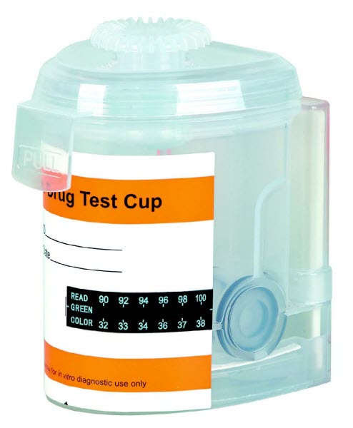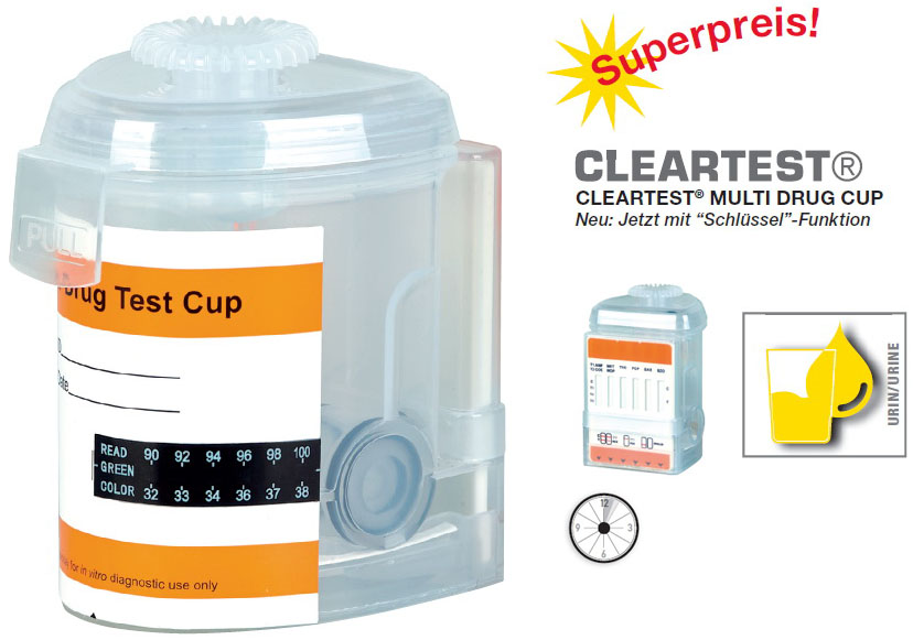 werden angezeigt. Um Manipulationen – z.B. durch Wasserzugabe – zu erschweren, kann am integrierten Thermometer die Einfüll-Temperatur des abgegebenen Urins kontrolliert werden. Jeder Testbecher ist einzeln eingesiegelt.