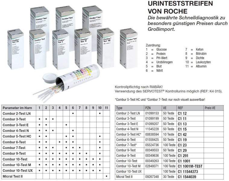 URINTESTSTREIFEN VON ROCHEDie bewährte Schnelldiagnostik zubesonders günstigen Preisen durchGroßimport.Zuordnung:1 = Glucose 2 = Protein3 = PH-Wert 4 = Urobilinogen5 = Blut 6 = Nitrit7 = Keton 8 = Bilirubin9 = Dichte 10 = Leukozyten11 = Albumin