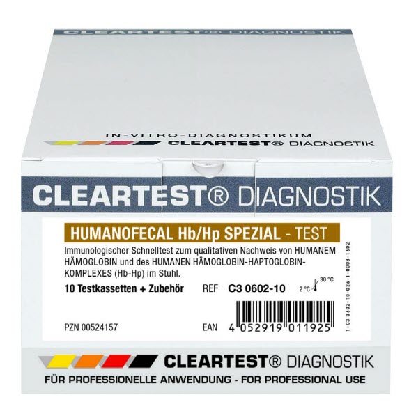 CLEARTEST® HUMANOFECAL HB/HP SPEZIALNachweis von Hämoglobin, Hämoglobin-Haptoglobin-Komplex.Immunologischer Stuhltest zum qualitativen Nachweis vonhumanem Hämoglobin und des humanen Hämoglobin-Haptoglobin-Komplexes im Stuhl. Dieser spezielle Stuhltest zeigtden eventuell im Stuhl vorhandenen Hämoglobin – HaptoglobinKomplex an. Dieser Komplex ist widerstandsfähiger als Hämoglobingegen die Umgebung des Verdauungstraktes und kann daher aufgastrointestinale Blutungen hinweisen, die höher als im Dickdarmauftreten.Nachweisgrenzen: Hb: 50 ng/ml, Hb-Hp-Komplex: 80 ng/ml.Auswertung nach 5 Minuten.Lagerung bei 2 - 30 °C.Type PZN VE REF Preis VEHumanofecal Hb/Hp Spezial 00524157 10 Teste C3 0602‑10Humanofecal Hb/Hp Spezial 00524163 20 Teste C3 0602‑20