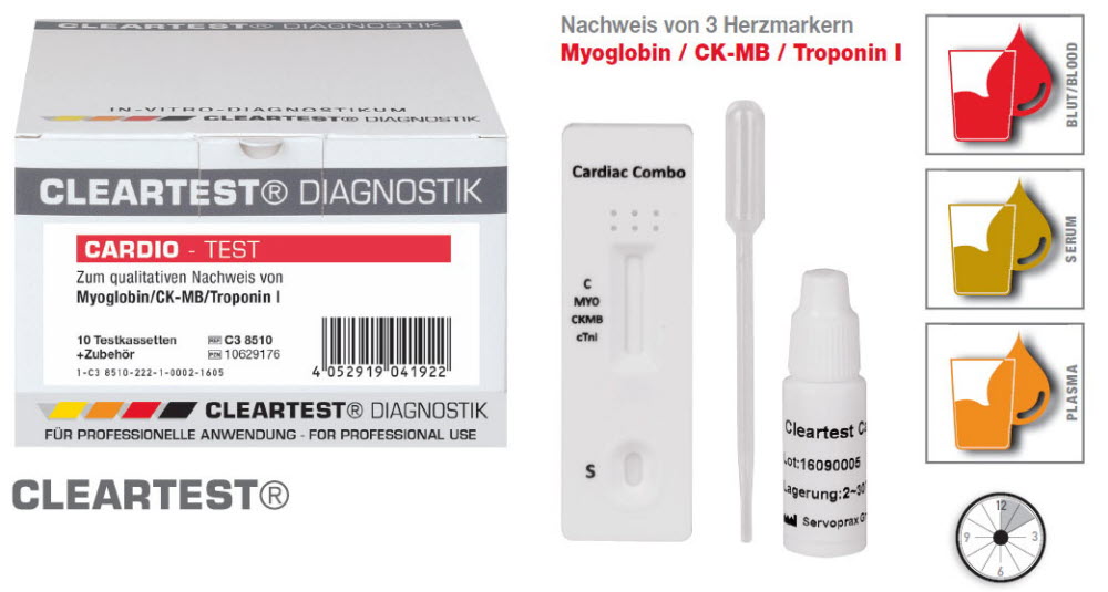Der CLEARTEST Cardio spielt mit seinen 3 Herzmarkern Myoglobin, CK-MB und Troponin I in der Differenzialdiagnostik, wie auch in der Verlaufs- und Therapiekontrolle eine große Rolle.